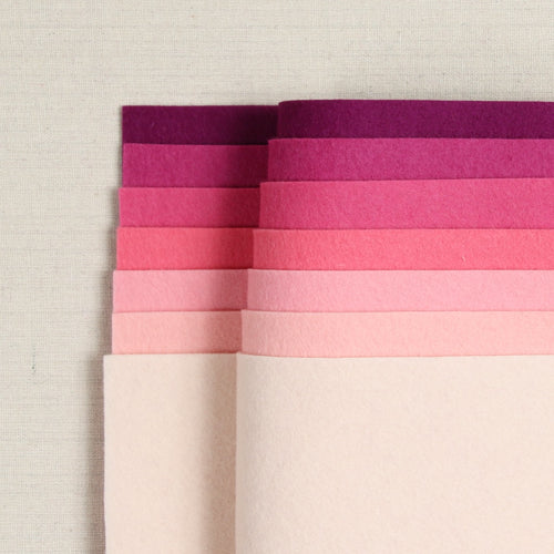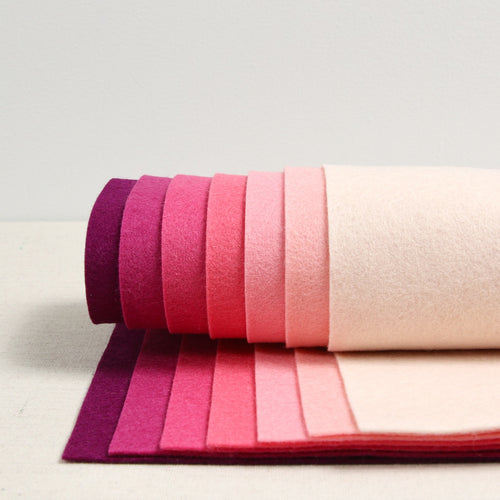 Berry Bliss felt palette features an ombre of pink hues from soft blush to bold berry. Perfect for Valentine’s Day projects, DIY décor, and embroidery, this vibrant color collection adds a touch of romance to every creation. Includes 7 colors in Crema, Tellina, Begonia, Hibiscus, Azalea, Boysenberry and Malbec. Coordinating DMC embroidery floss palette and a Sulky Thread is also available.