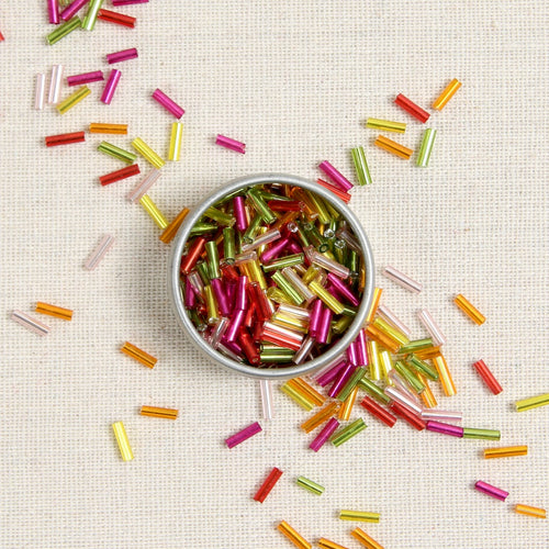 Silver-lined sprinkles for your felt cupcakes and doughnuts! Glass bugle beads are 6mm long and come in a mix of colors including Pink, Fuschia, Red, Tangerine, Yellow and Lime. Each hand mixed tin includes 9 grams or 200 beads.