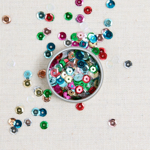Metallic 5mm sequins catch the light and provide sparkle to your project. Includes a mix of sequins in the colors Iridescent, Bronze, Gold, Kelly, Silver, Pink, Red, Aqua, Turquoise and Fuchsia, 4 grams total. Hand tinned and made in the USA.