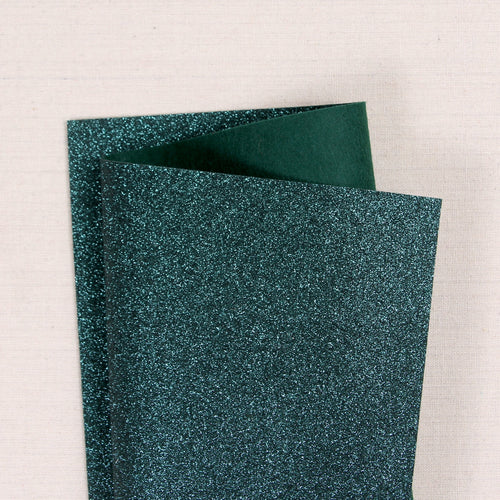 Add a bit of shine or a whole lot of sparkle with Benzie's glitter felt in deep green Evergreen. The best part? The glitter sticks just where it needs too-no messy fairy dust to clean up! Glitter felt is rough and sparkly on the glitter side and soft and smooth just like the felt you are used too! Felt side coordinates with our Evergreen Felt. Use any way you use regular felt. Approximately 1mm thick.