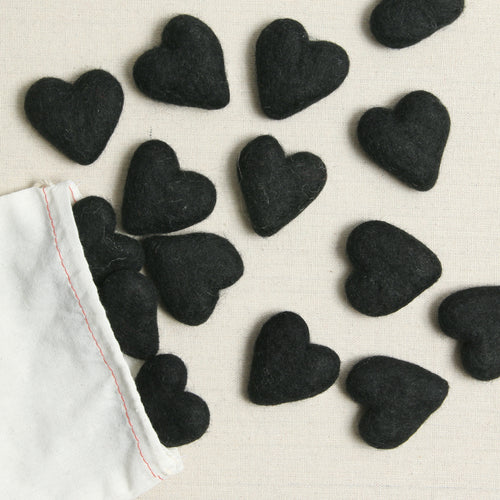 All the love for heart shaped wool poms in pure Black! Add them to a garland, make a tassel or just put one in your pocket to remember you are loved. Includes 12 soft felted wool hearts that are approximately 2" wide. Due to their handmade nature, no two are alike.