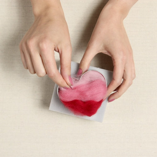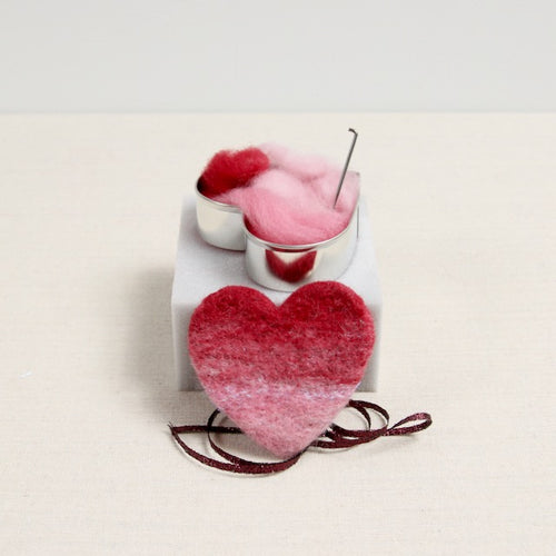 Includes everything you need to get started felting: Felting foam, felting needle, cookie cutter, wool roving, Angelina fibers and ribbon.