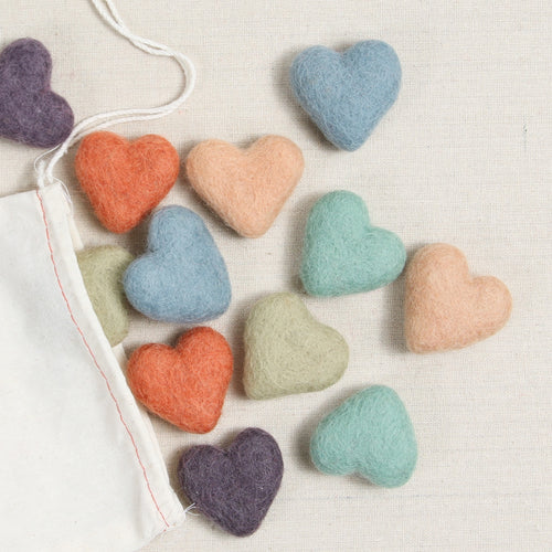 Includes 12 hearts in Mojave, Cameo, Loden, Swan, Salt Water and Violet (two of each color). Soft felted wool hearts are approximately 2" wide. Due to their handmade nature, no two are alike.