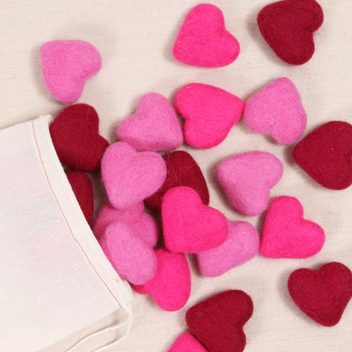 All the love for heart-shaped wool poms in our Mixed Pink colors Cranberry, Magenta + Foxglove!! Add them to a garland, make a tassel or just put one in your pocket to remember you are loved. Soft felted wool hearts are approximately 2" wide. Includes 12 hearts. Due to their handmade nature, no two are alike.