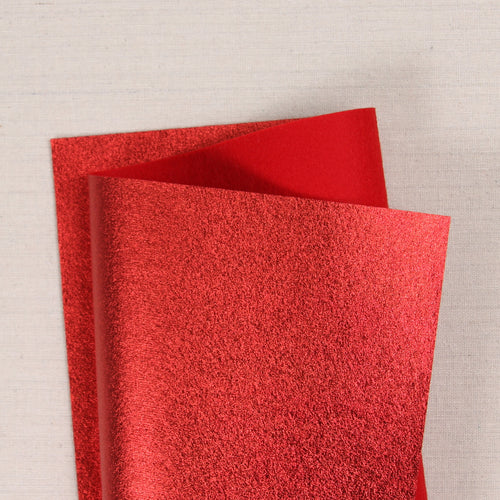 Shiny metallic red bonded to felt resembles soft lambskin leather! Soft and pliable, use it any way you would use felt. Felt coordinates to wool blend felt in Red.