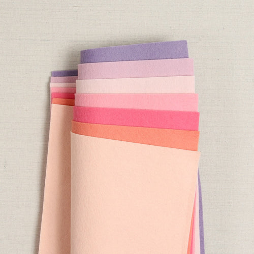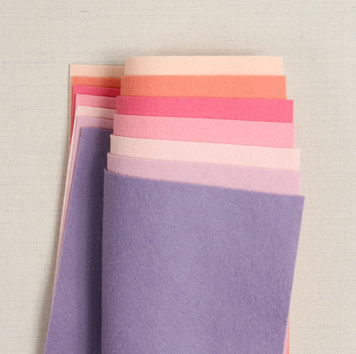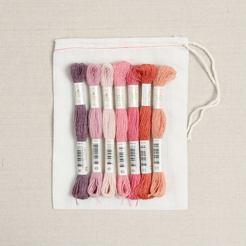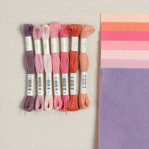 Summer Glow captures the magic of sunlit coral afternoons and dusky violet sunsets. This palette includes seven colors of 100% wool Bellwether in Apricot, Salmon, Hibiscus, Begonia, Plie, Orchid and Amethyst. Coordinating Eco Vita Thread is also available.