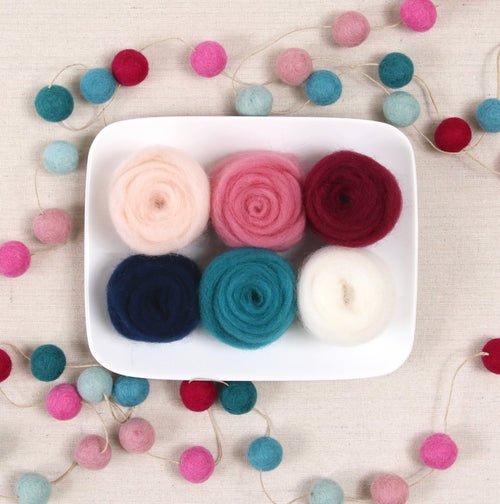 America's sweetheart. Roving in an ombre color palette of Oats, Rose, Burgundy, Midnight, Peacock and White. Select six 1/2 ounce or 1 ounce balls of sliver roving for use in needle felting, wet felting, or weaving.