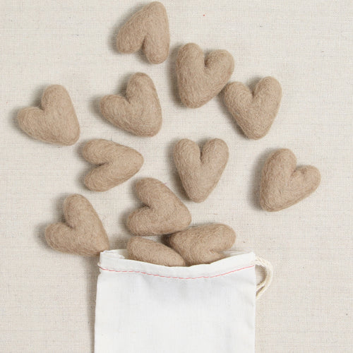 Sweet hand felted hearts are approximately 1 5/8" wide by 1 1/2" tall. Includes 12 hearts of one color. Other muted Sweetheart hues include Blush, Geranium, Violet, Allium, Taffy and Mulberry.
