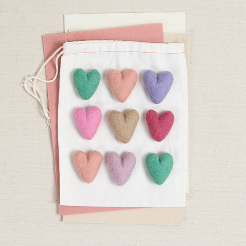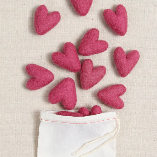 Sweet hand felted hearts are approximately 1 5/8" wide by 1 1/2" tall. Includes 12 hearts of one color. Other muted Sweetheart hues include Castle, Blush, Geranium, Violet, Allium, and Taffy.