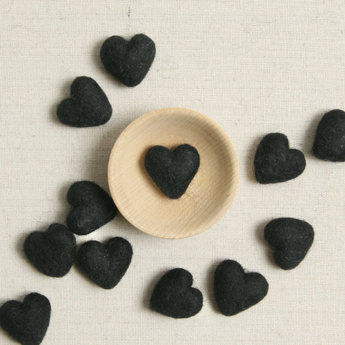 Black wool felt hearts in our tiny size are just over 1" wide. Due to their handmade nature, no two are alike. Includes 12 hearts total.