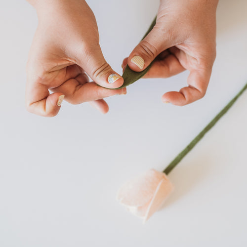 The Garden Tulip, a spring-blooming flower, is best recognized for it's large, symmetrical, bright and showy blooms, usually in warm colours. Thought to be first culivated in Persia in the 10th century, tulip bulbs were brought to central Europe in the late 1500s, at which point "tulip mania" took over. By the 17th century, it is said that full properties were being traded for a single tulip bulb! Talk about pressure to keep that flower alive! The good news is, with your felt tulips, you'll never have to stress about their upkeep, or trade your farm for a bulb.