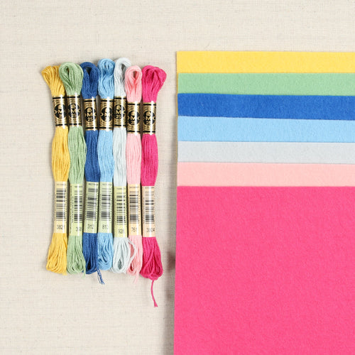 Bring in some sunshine! Pure 100% wool includes seven (7) sheets of felt in Azalea, Tellina, Lunar, Cornflower, Cobalt, Agave and Canary. Coordinating DMC embroidery floss is available.