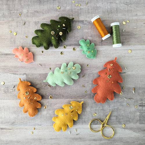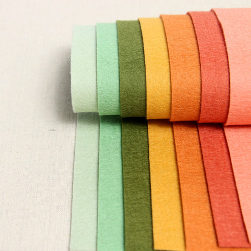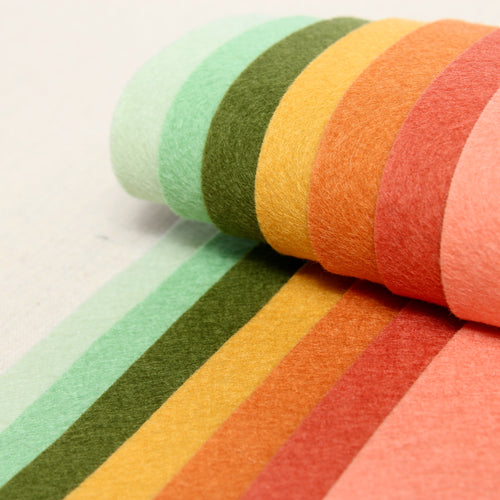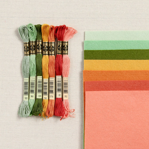 A gradation of 100% wool in Salmon, Rooibos, Chantenay, Butterscotch, Nori, Agave and Laurel. Includes 7 sheets of felt. Coordinating DMC embroidery floss is also available.