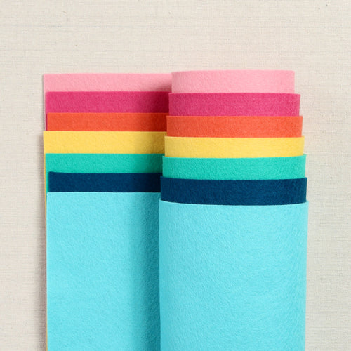 Pure 100% wool felt in our favorite brights of Begonia, Azalea, Persimmon, Canary, Teal, Magpie and Capri. Seven sheets total. Coordinating DMC embroidery floss is also available.