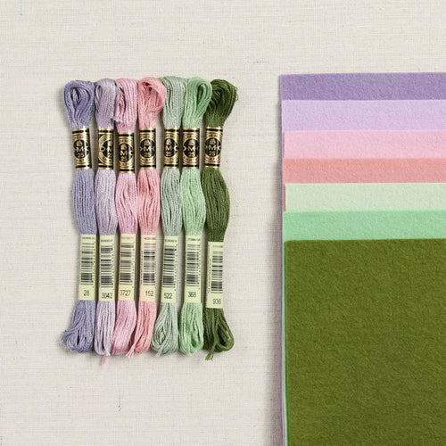 Imagine artfully formed succulents seated behind a frame of glass -your own felt terrarium. Seven 100% wool felt colors include Amethyst, Allium, Orchid, Rose Quartz, Laurel, Agave and Nori. Coordinating DMC embroidery floss is also available.