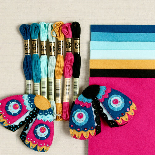 Created by designer Erin Paisley to coordinate with the Midnight Moth pattern and die. Includes colors Magpie, Cerulean, Nordic, Seamist, Butterscotch, Black and Cerise. Coordinating DMC embroidery floss and Sulky Threads are available.