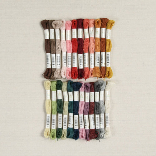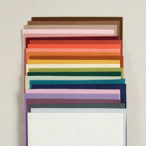 Inspired by hand dyed wool threads -this collection of 24 colors is a beautiful Mosaic of our favorite muted Bellwether hues. Includes 100% wool felt in the colors Hazelnut, Cocoa, Cashmere, Plié, Rose Quartz, Pinot, Paprika, Persimmon, Salmon, Chantenay, Umber, Butterscotch, Custard, Willow, Sherwood, Laurel, Viridian, Orion, Orchid, Amethyst, Fig, Slate, Lunar and White. We recommend trying our coordinating DMC Eco Vita Threads!