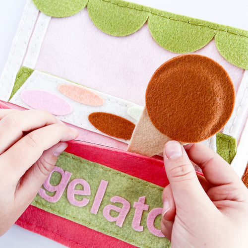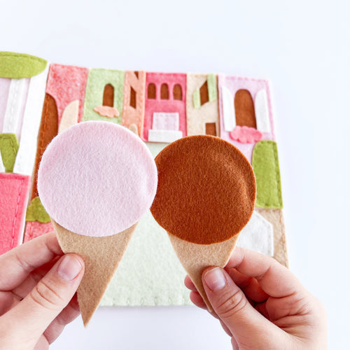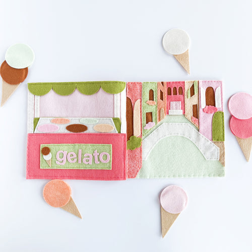 Gelato in Venice features an Italian gelato cart filled to the brim with every flavor of gelato you can imagine! One scoop, two scoops... stack those scoops as high as you like—there's plenty of room to fit them all in the hidden gelato cart pocket. Enjoy your gelato cones with the stunning canals of Venice as a backdrop. Your globe-trotting foodie can count, share, and play while becoming acquainted with The Floating City!
