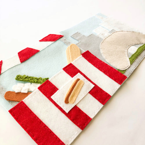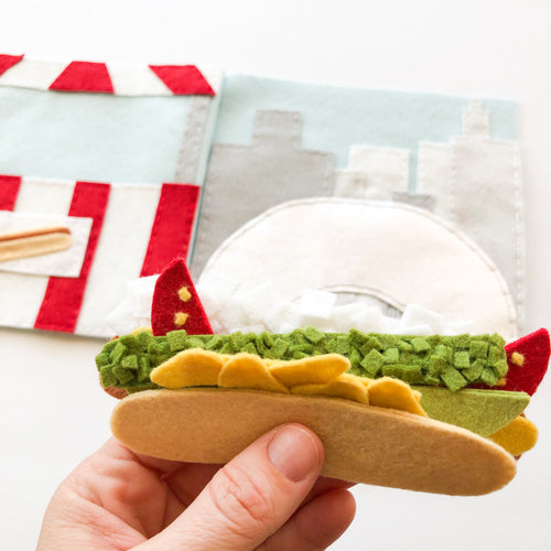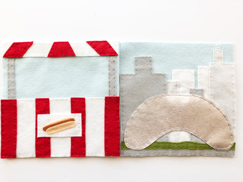 Hello from the Windy City! Your little kiddos will enjoy hours of imaginative play with the Hotdogs in Chicago Quiet Book pattern by BlueberryPatterns! This page features a hotdog stand with traditional red and white stripes. There is also a convenient pocket to hold your hotdogs and toppings: mustard, tomatoes, pickle spears, relish, chopped onions, and sport peppers--everything you need to make the perfect Chicago-style hot dog! Enjoy those hotdogs with the iconic Cloud Gate sculpture (affectionately referred to as "The Bean") as a backdrop. Your globe-trotting foodie can check out the city while gaining an appreciation for the culinary masterpiece that is the Chicago Dog!