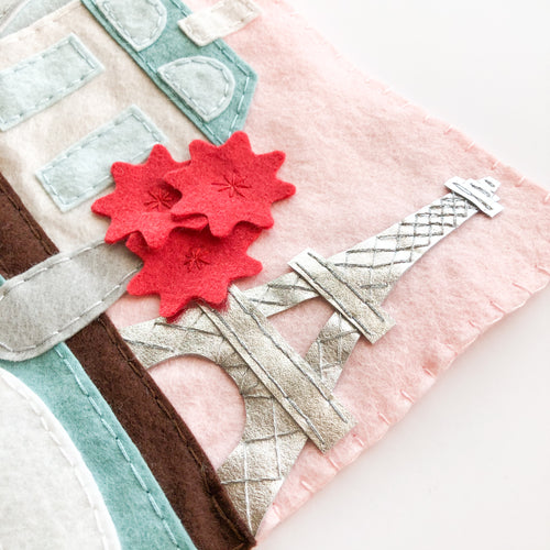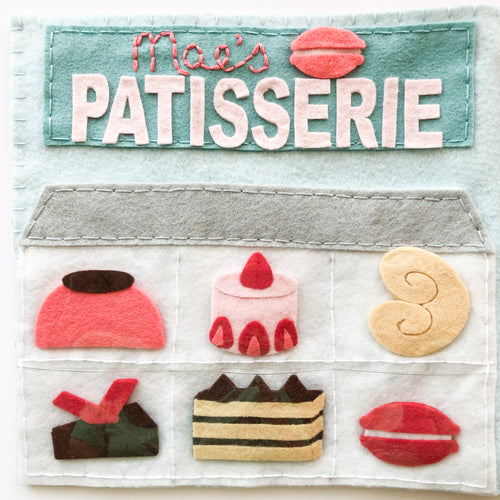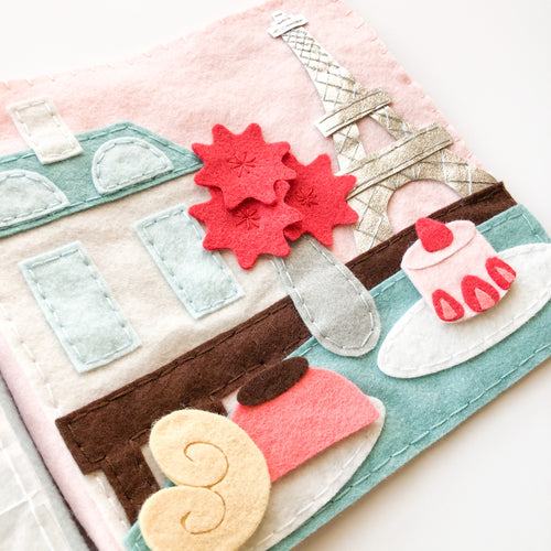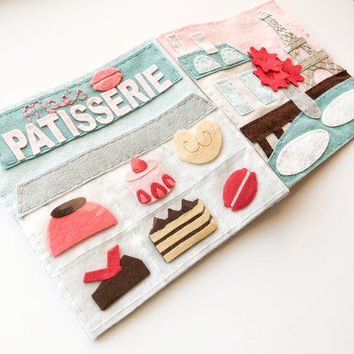Bonjour! Your little ones will enjoy hours of imaginative play with the Pastries in Paris Quiet Book pattern by Blueberry Patterns! This page features a French patisserie. Clear pockets in the patisserie case hold all the scrumptious treats you could imagine-- a macaron, palmier, gateau au chocolat, fraisier, and more! Enjoy your pastries with the captivating Eiffel Tower as a backdrop. Your globe-trotting foodie can soak in the City of Love while gaining an appreciation for the charming pastries that call France home!
