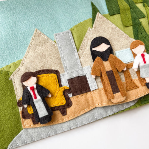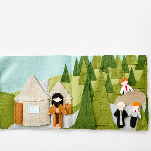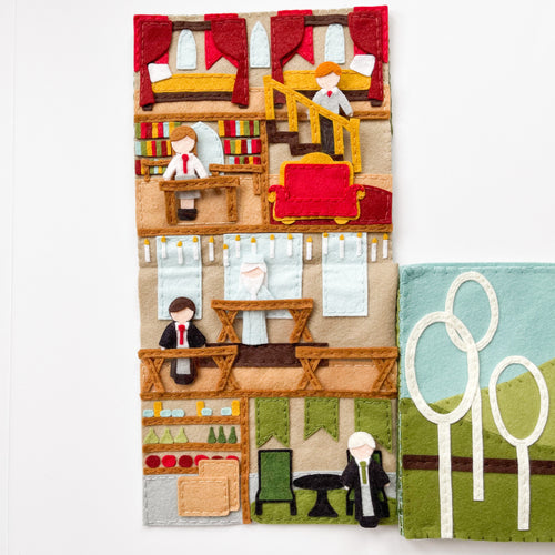 Get ready for a magical adventure! Your little one will enjoy hours of imaginative play with the Wizard Academy Quiet Book by Blueberry Patterns! Wizard Academy features a magical castle that folds out to reveal four stories-- from a potion storage closet in the dungeon, to a large dining hall, to a book-filled library, to a bedroom tucked in the highest tower. The other page features a sports field with a pocket stand for students to watch the match. The sports field folds out into an enchanted forest. A tiny hut at the edge of the forest, also folds out so characters can play inside the hut. The forest scene includes plenty of flaps and pass-throughs for your characters to explore! Each page of the finished spread will measure 8"x 8" when folded. The school page expands vertically to 8" X 16" and the sports field/forest page expands horizontally to 16" X 8."