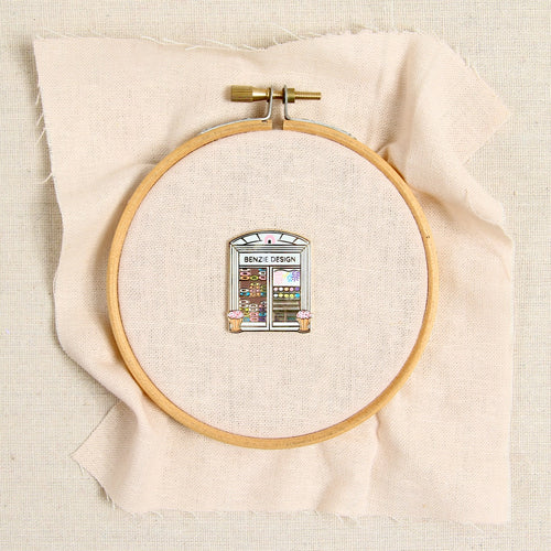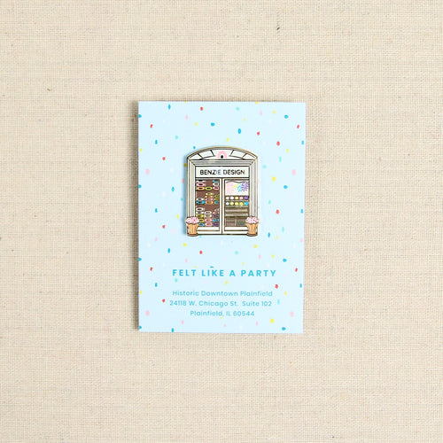 You may not be able to visit Benzie's brick & mortar shop but you can add the cute Benzie storefront pin to your collection! Includes a pin back. Approximately 1 1/4 x 1" wide.