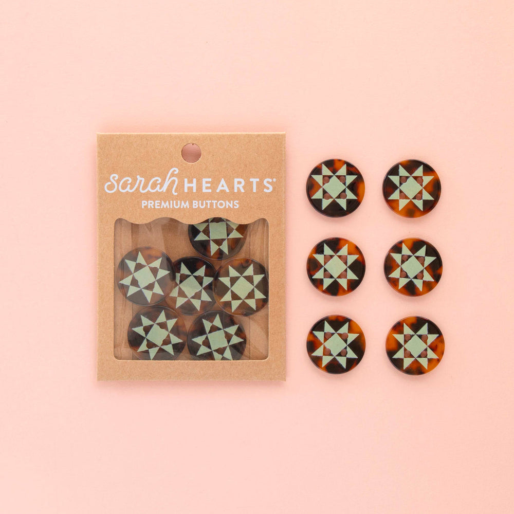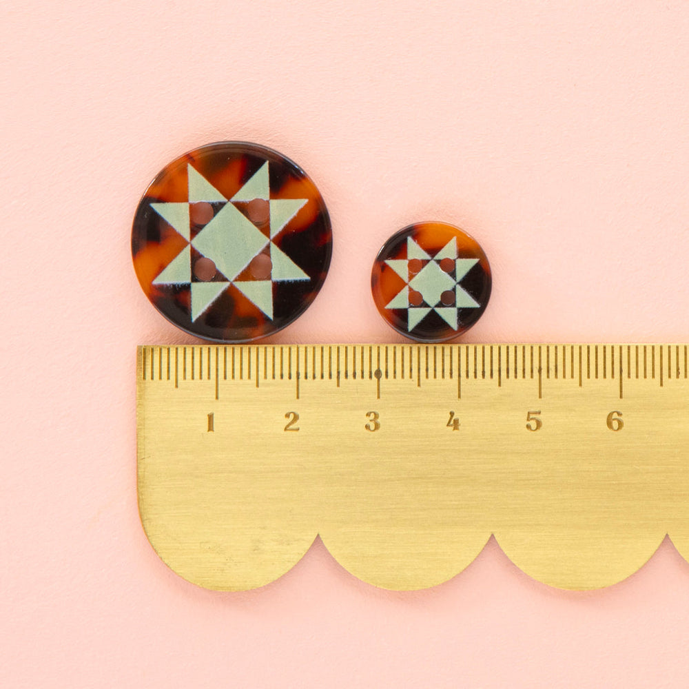 Add some quilty charm to your projects with these Quilt Star Buttons. Made from eco-friendly cellulose acetate, each button features a round tortoise shell design topped with a crafty cream printed quilt star. They're the perfect cheerful accent to brighten up any garment or bag. Hand wash or machine wash on gentle cycle.