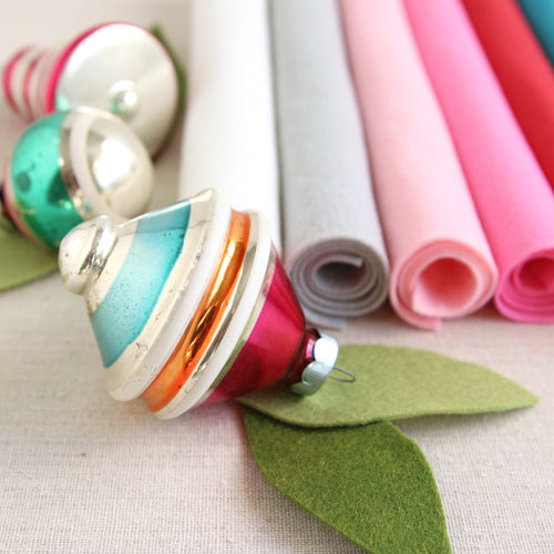 I fondly remember unwrapping each of Grandma's carefully packaged ornaments -so delicate and fragile -frosted and glitter adorned. The pastel hues were worn but still shining so bright on the lite tree. "Glitter & Glass" includes the soft shades I remember: White, Silver, Pink, Flamingo, Strawberry, Peacock, Swan, Fern, Moss and Ochre. Coordinating DMC floss is also available.