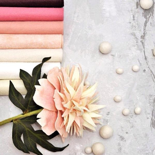 Benzie's wool blend felt in Ecru, a perfect off-white ivory color. Select cut sheet or yardage-multiples of 1/2 yard cuts will yield one uncut sheet. Our bolts are approximately 36" wide. Full bolts are 40% off the retail price of cut sheets. Inventory on full bolts is limited, please contact us for availability.