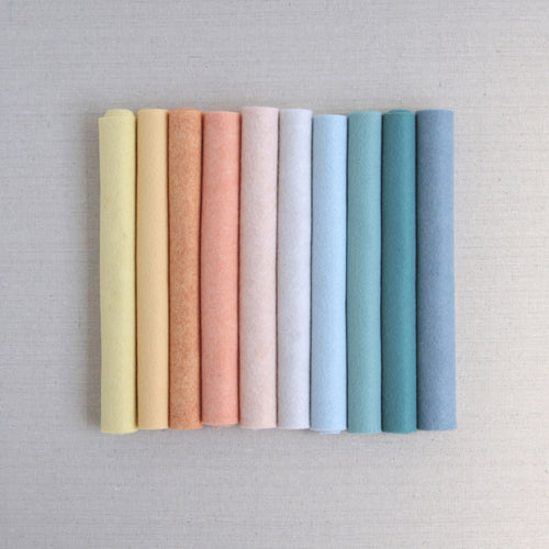 Benzie's wool blend felt in Peacock. Select cut sheets or yardage-multiples of 1/2 yard cuts will yield one uncut sheet. Our bolts are approximately 36" wide. Full bolts are 40% off the retail price of cut sheets. Inventory on full bolts is limited, please contact us for availability.