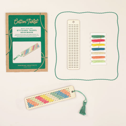 Our Stitched Tassel Bookmark Kit, a delightful blend of creativity and functionality. Inside each kit, you'll find a sturdy wooden bookmark ready to be stitched, a pack of pastel-coloured cotton threads and a durable metal embroidery needle.