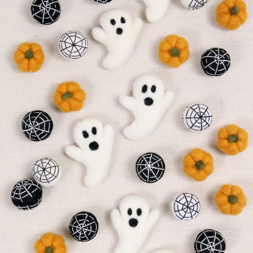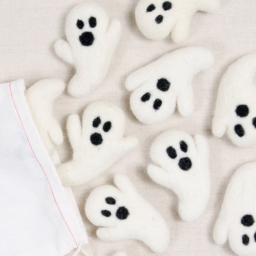 Needle felted spooky + sweet ghosts measure approximately 3"x2" and 1/2" wide. Includes one ghost.