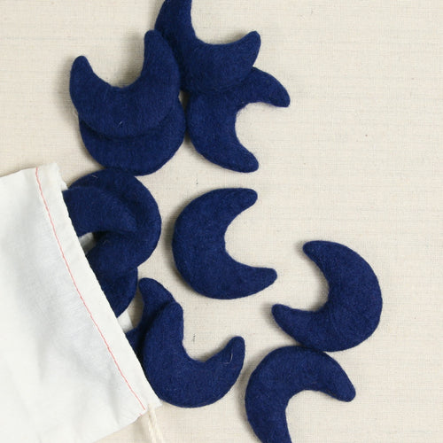 Thinly felted crescents measure approximately 2 1/2" x 2" wide. Includes 12 moons. Hand felted, all sizes are approximate.