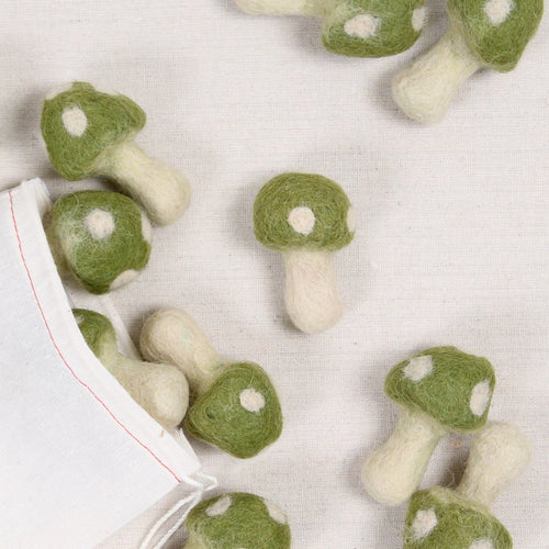 Felted mushroom in Moss. Add to a garland, use in autumn decor, or give to your favorite little one for felt food play. Each mushroom is approximately 2 1/2" by 1 1/2" wide.