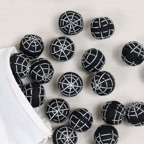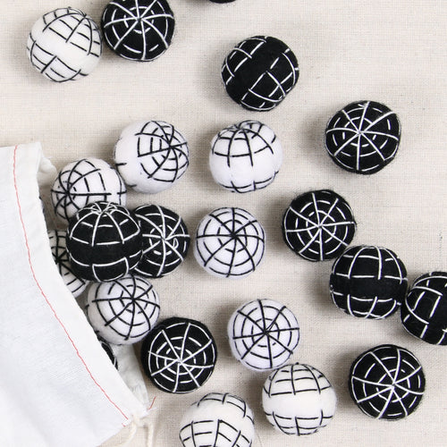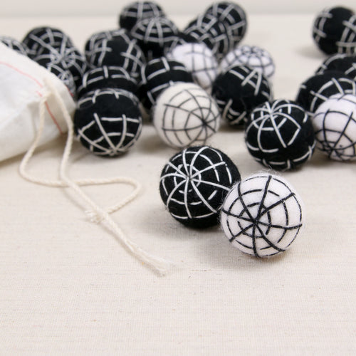 Black large sized poms stitched with a white web. Includes 12 poms total. Approximately 1 1/4" size.