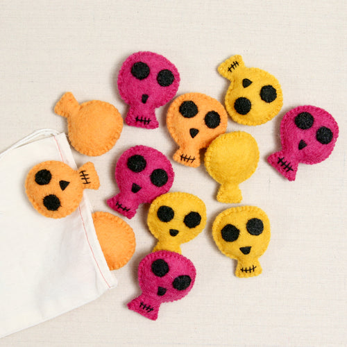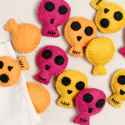 Hand stitched sugar skulls come in bright Cerise Pink, Ochre Yellow and Papaya Orange. Includes six skulls that measure approximately 2" wide by 2 3/4" tall. Embroider and decorate as you wish!