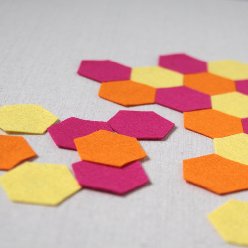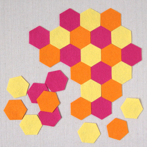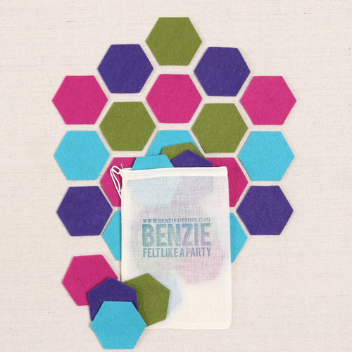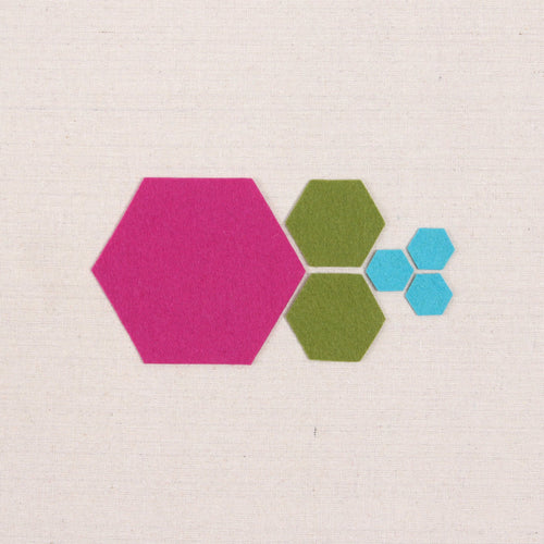 We love felt hexagons! Our small hexagons are one inch wide with 1/2" sides and include 120 hexies per package. Our medium hexagons are two inches wide with 1" sides and include 32 hexies per package. The standard palette includes Concord, Fuchsia, Moss and Peacock; or select a custom palette of up to four colors!