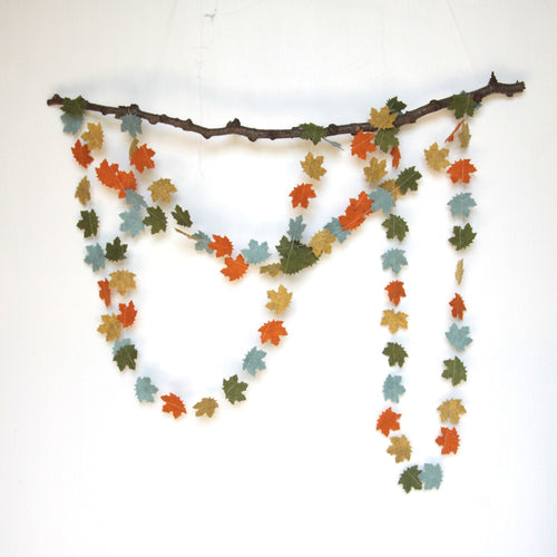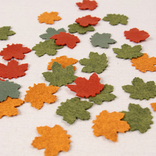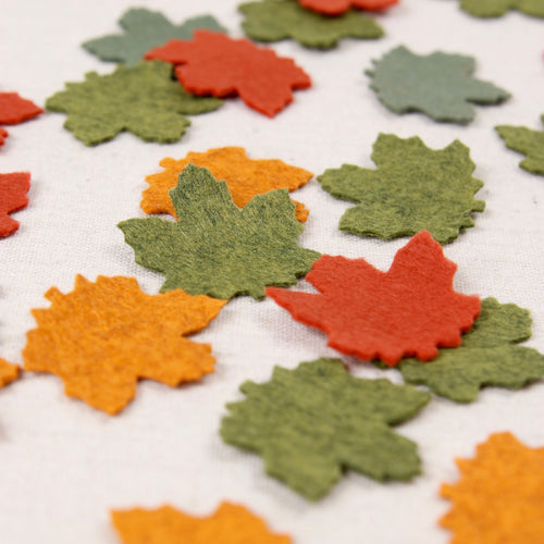 Benzie's felt-fetti comes in a 1 1/2" classic maple leaf shape. You will receive approximately 48 leaves. The standard palette includes Copper, Pumpkin, Zucchini, and Blue Spruce; or select a custom palette of up to four colors!