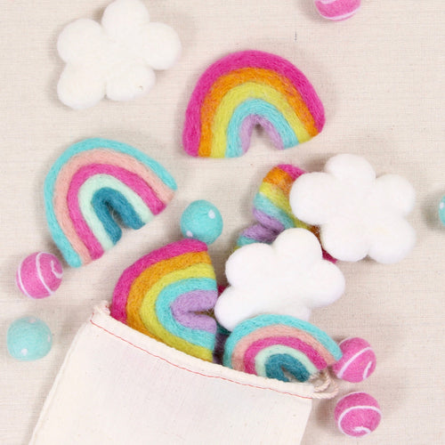 Make anyone happy with this needled felt rainbow in brights! Measures approximately 3 x 2 1/4 inches wide by 1/2 inch thick, includes one rainbow. Grab your roving to add a needle felt cloud or purchase a premade one to match! Designed by Kiki and Bee.