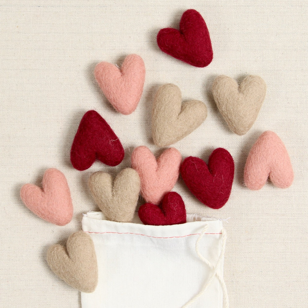 Sweet hand felted hearts are approximately 1 5/8" wide by 1 1/2" tall. Includes 12 hearts in the colors Cranberry, Blush and Castle.