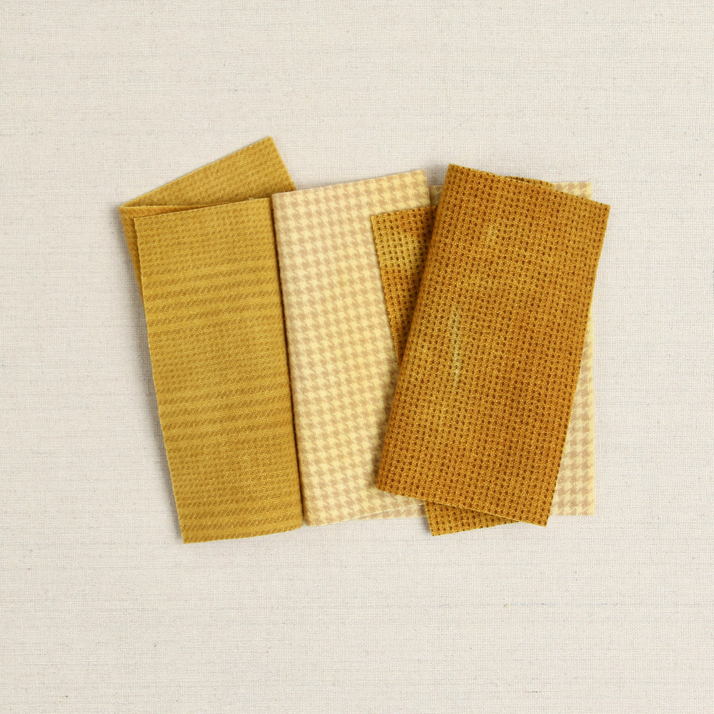 Hand dyed wool in herringbone, houndstooth and dots. Felted wool starts as 100% woven wool that's been washed and felted for softness and body. This bundle includes three amber yellow shades that are approximately 6x9 inches each.