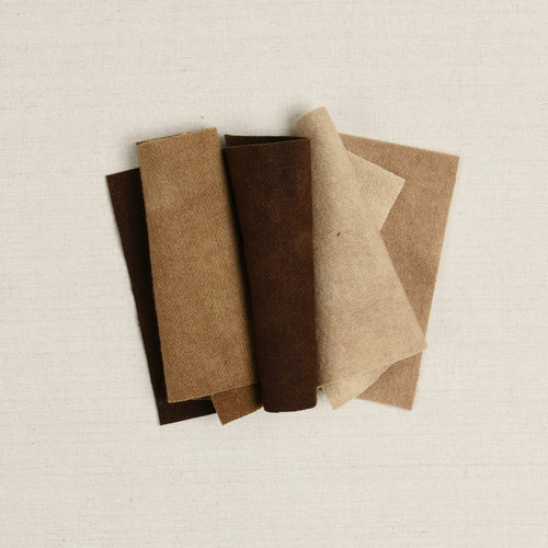Felted wool is a 100% woven wool that has been washed and felted for softness and body. Hand-dyed textiles often have a mottled or marbled finish that will add natural variance and softness to your craft. This bundle includes three mocha brown shades that are approximately 6x9 inches each.