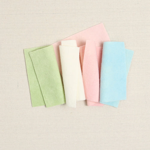 Felted wool are quilters' favorite for applique and a standard in penny rugs. Can be rug hooked or added to embroidery for extra texture. Felted wool is a woven fabric that has been washed so it doesn't fray and is super soft! Includes 5 colors, 5x5" each. Hand over dyed. Wooly Charms by In the Patch