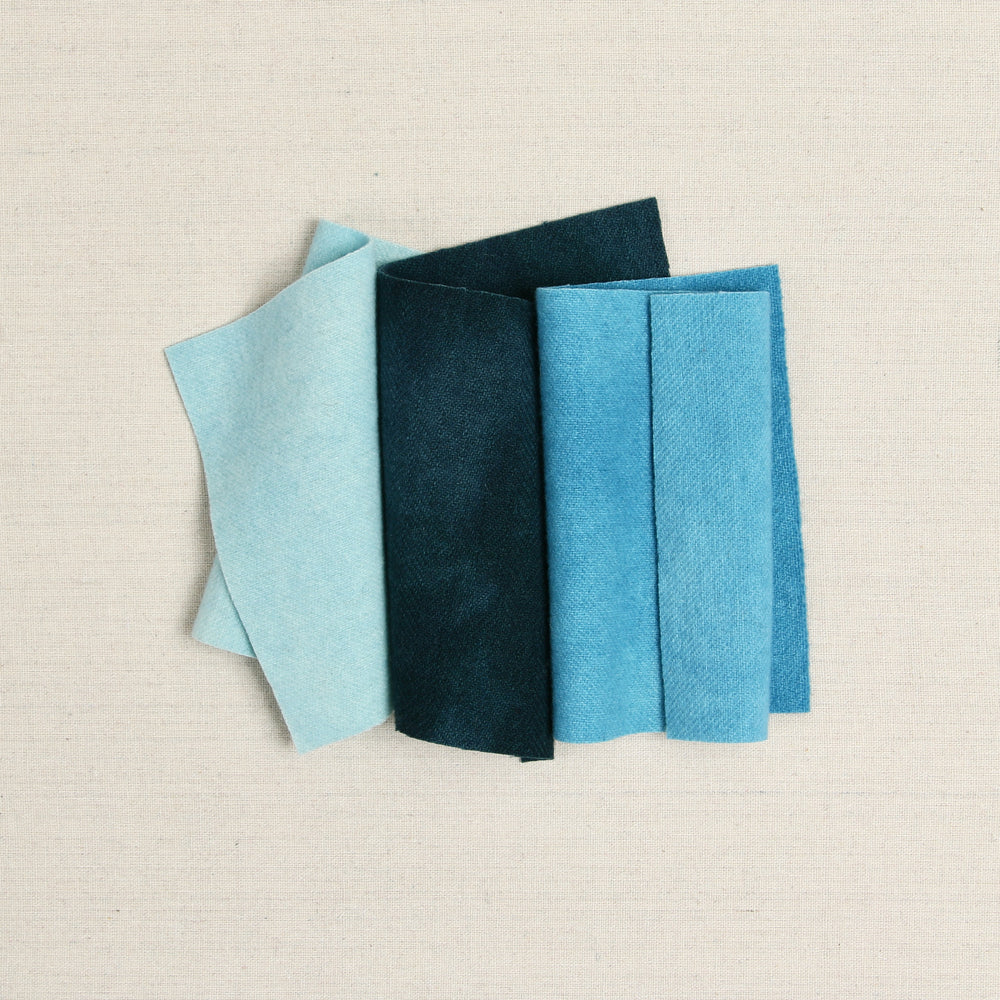Felted wool is a 100% woven wool that has been washed and felted for softness and body. Hand-dyed textiles often have a mottled or marbled finish that will add natural variance and softness to your craft. This bundle includes three aqua blue shades that are approximately 6x9 inches each.