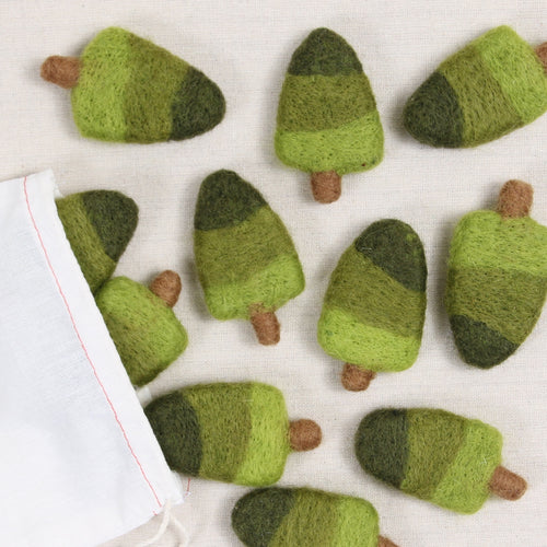 Create a forest of felted firs! Includes one needle-felted tree in Meadow, Moss and Fern. Approximately 3" tall and 1 1/2" wide and a 1/2" thick.