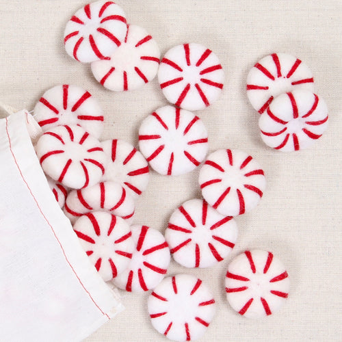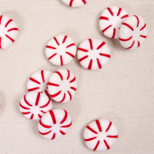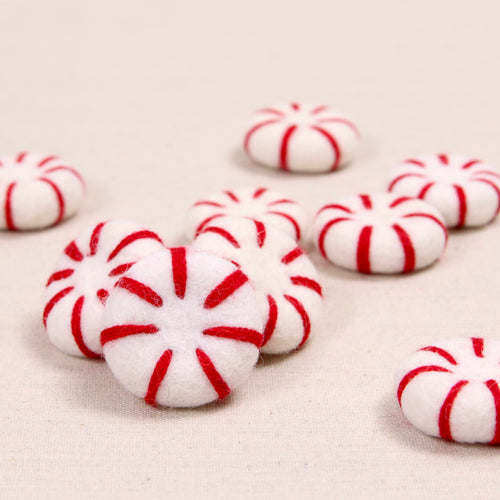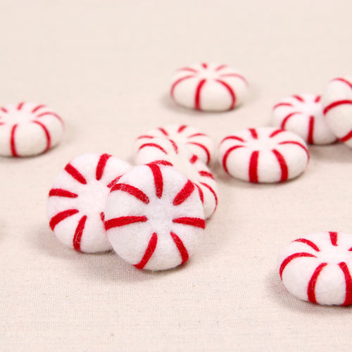 Oversized felt peppermint candies make the holidays sweet! Approximately 1 5/8" wide and 1/2" thick (4.5cm x 11mm) and includes 8 red rings to create the fun peppermint look! These make great ornaments, gift toppers and embellishments for wreaths. Handmade and firmly felted, no two are alike. Packs of 12.