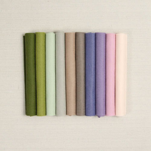 The charm of a dappled cobblestone pathway evokes a palette inspired by the 2025 Pantone colors of the year. Includes 10 shades of both wool blend and pure felt in Moss, Fern, Laurel*, Terazzo*, Cashmere*, Morel*, Violet, Amethyst*, Orchid* and Crema*. Coordinating DMC floss is also available. *Indicates Bellwether 100% felt. Coordinating DMC embroidery floss is also available.