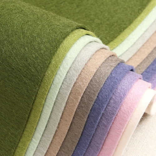 Benzie carries a variety of felt in a wool blend, pure wool and in glitter and metallic finishes. Wool blend felt includes 20-35% wool while Bellwether is 100% wool felt. Glitter and metallic are backed with Bellwether felt. All are approximately 1mm thick and vary in density.