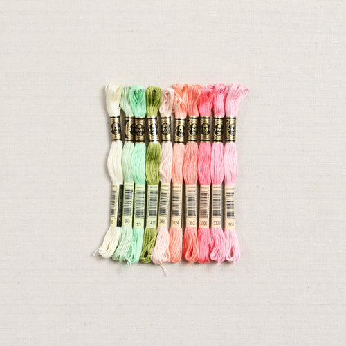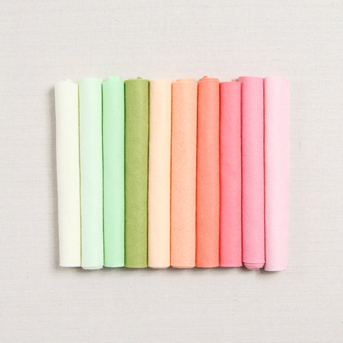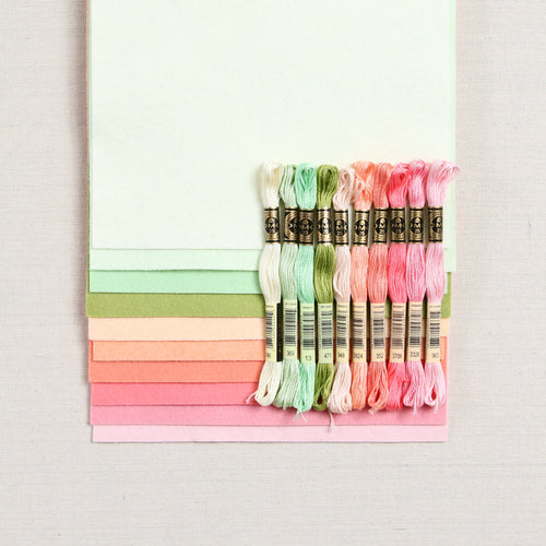 Sweeter than the frozen treat. Ten sheets in a ripe + delicious color palette of Ecru, Mint, *Honeydew, Fern, Peach, Guava, *Salmon, Coral, *Begonia and Peony. Melon Sorbet is a mix of wool blend felt and 100% wool felt sheets, *notes Bellwether felt. Coordinating DMC embroidery floss is also available.