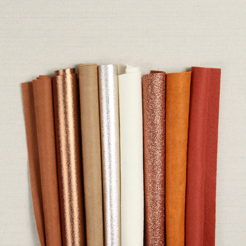 Our Medley Palettes include a mix of 100% wool felt, blend and specialty felt in 9x12" size. Pumpkin Spice Latte includes Cinnamon, Bronze Metallic, Latte, Champagne Metallic, BW Ecru*, Copper Glitter, Pumpkin and Paprika* -8 sheets total. *Notes 100% Bellwether wool felt.